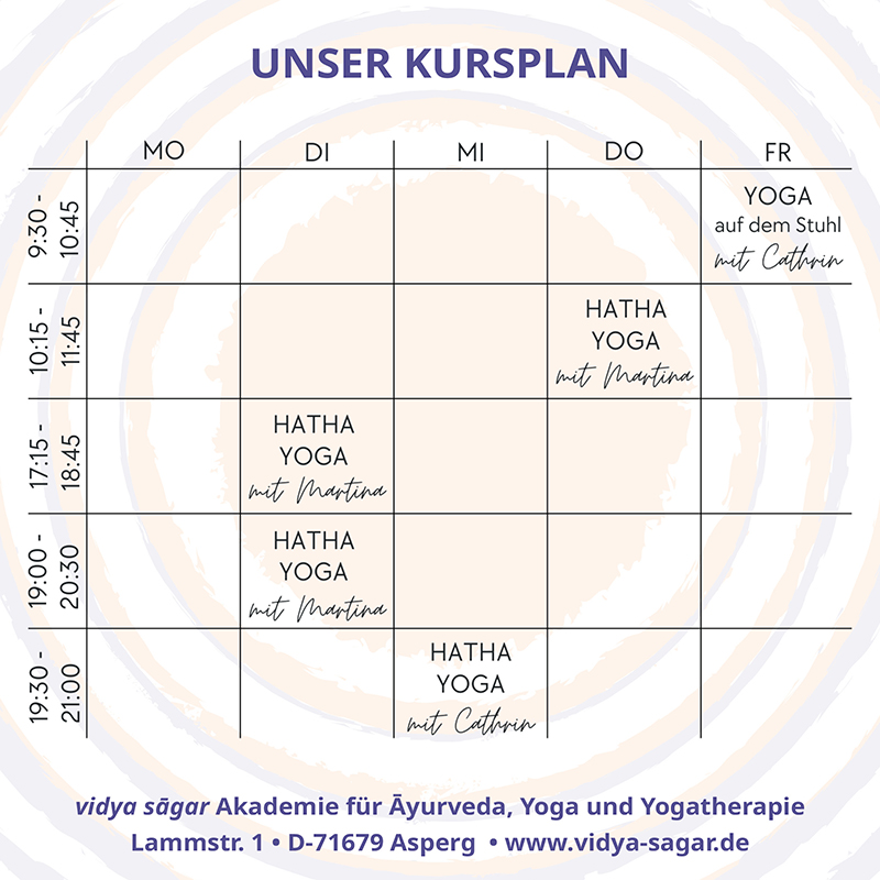 Die Yogastunden werden als geschlossenes Kurssystem angeboten. So kann sich ein Gruppengefühl einstellen, neue Freundschaften werden geschlossen und die Yogalehrer können besser auf die Bedürfnisse der Gruppe eingehen. Zudem tragen die festen Termine zu einer regelmäßigen Teilnahme bei.